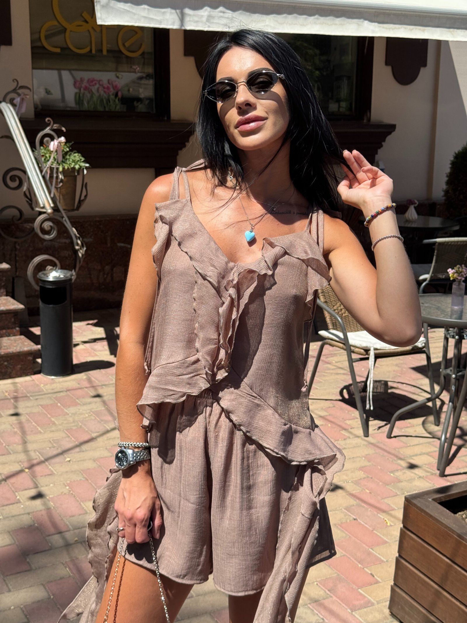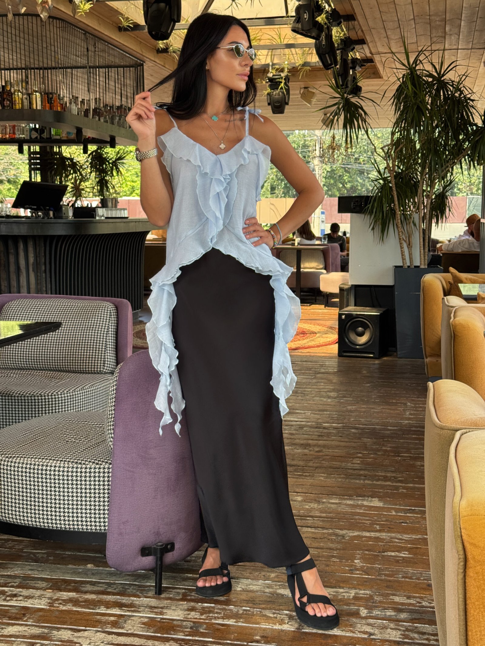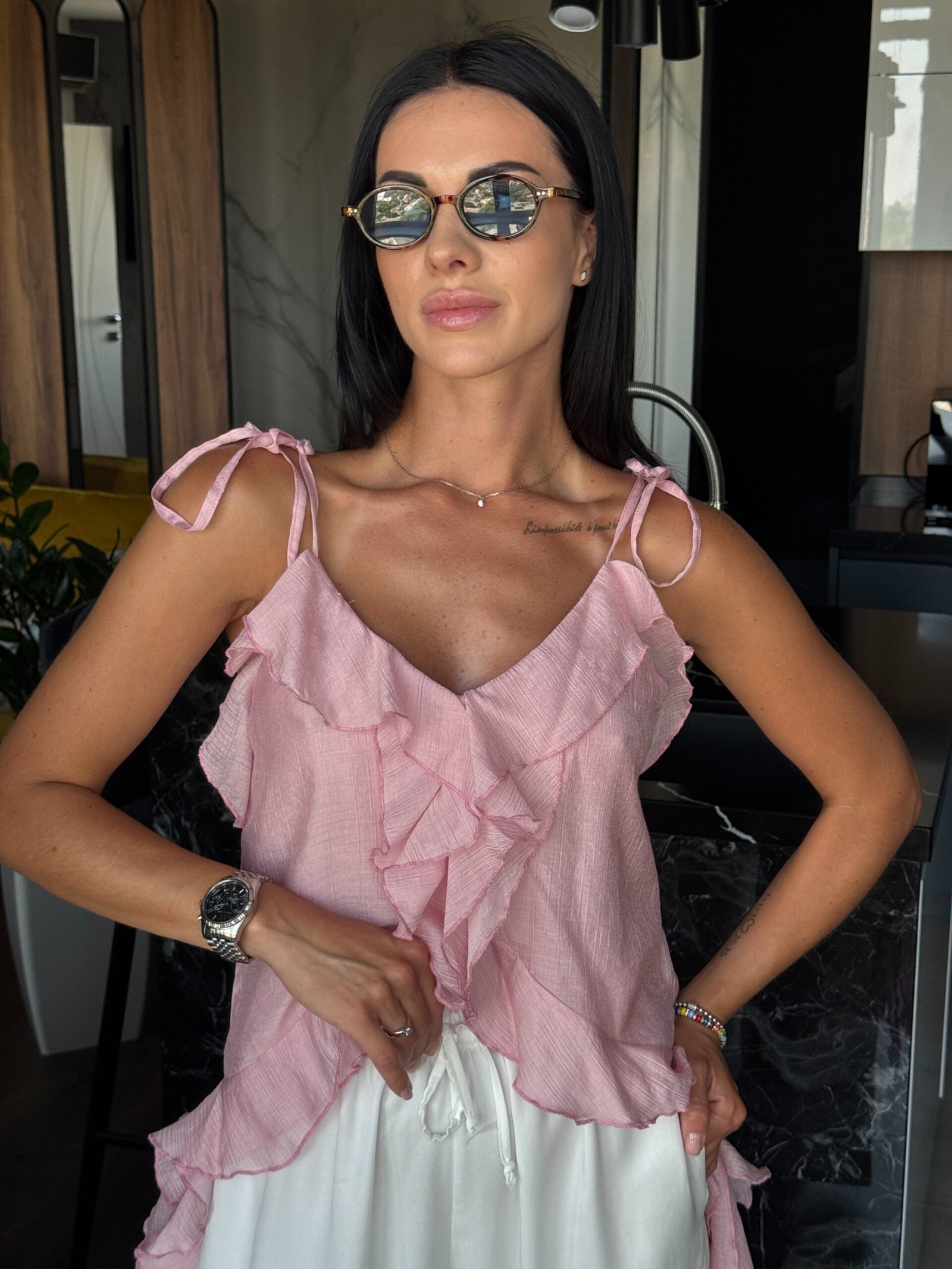 Блуза з натурального шифону — це легкий акцент у вашому літньому гардеробі. Напівпрозора текстура додає образу повітряності, а натуральна бавовняна основа забезпечує комфорт навіть у найспекотніші дні. Ідеально поєднується з джинсами, спідницями або шортами для створення легких романтичних луків.