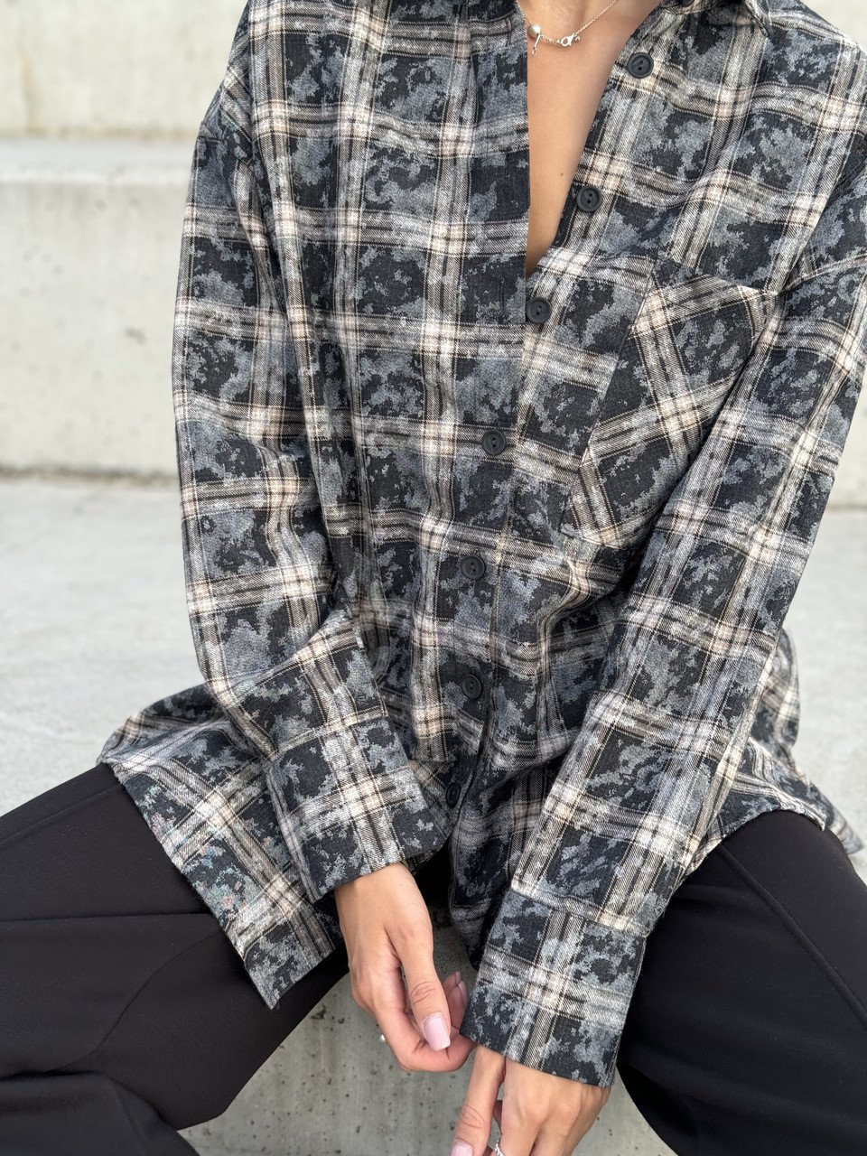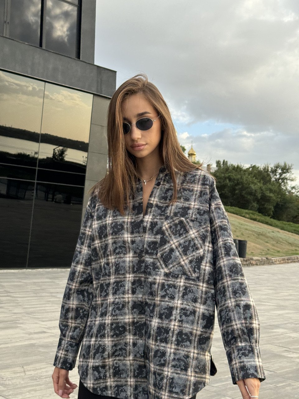 Повсякденна картата жіноча сорочка one size з мармуровим ефектом, Стильна картата сорочка на ґудзиках