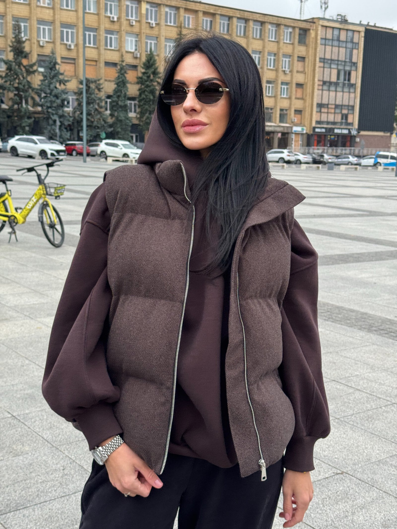 Жіноча трендова кашемірова жилетка з кишенями, Тепла оверсайз безрукавка наповнювач екопух із коміром