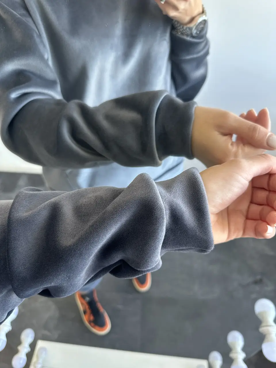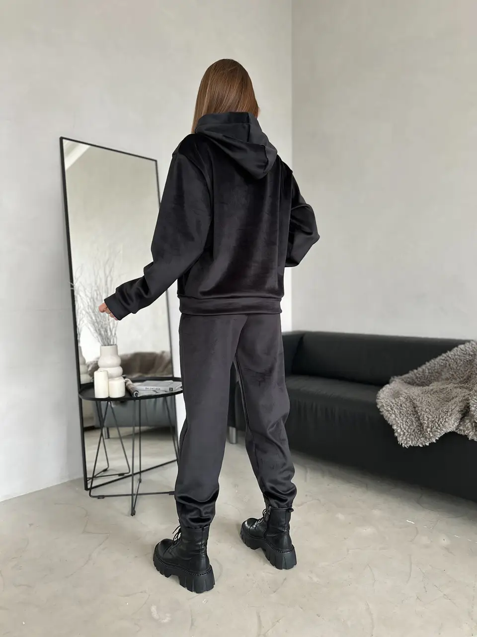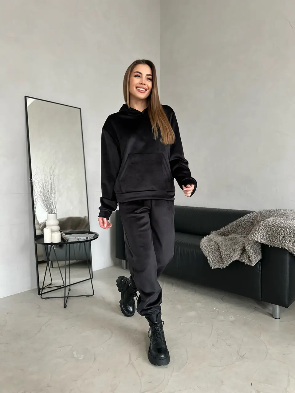Жіночий м’який костюм з велюру двостороннього: худі та штани (чорний, фрез, графіт) – KAKAO brand